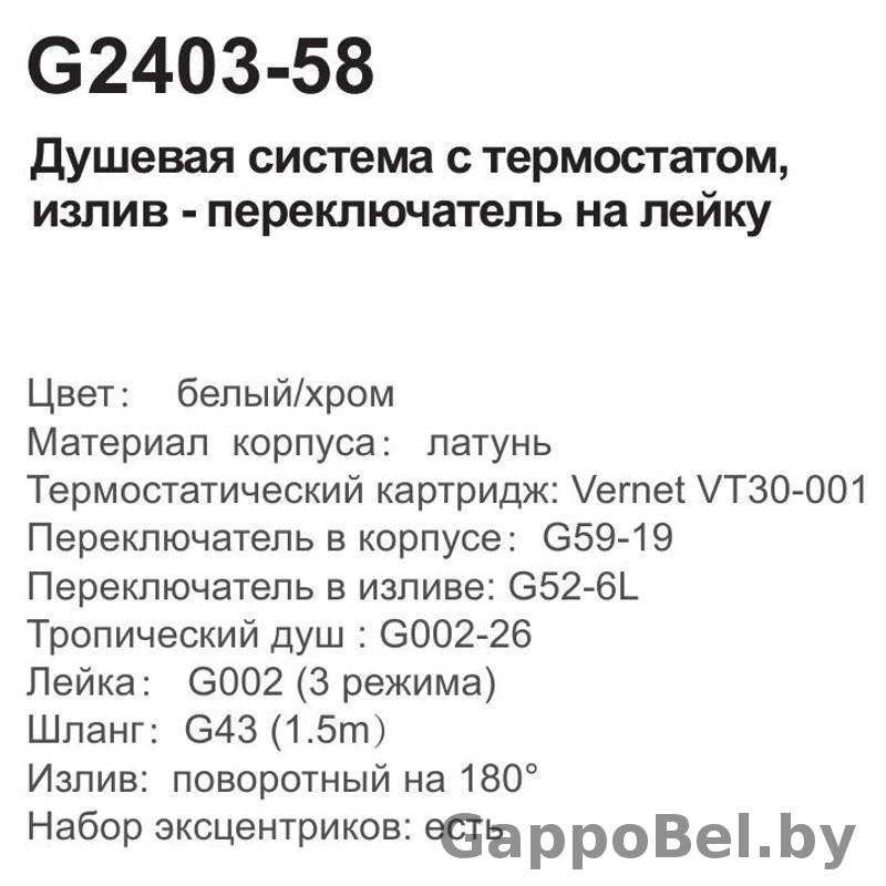Душевая стойка с термостатом Gappo G2403-58 имеет белый цвет с хромом. Душевая система хорошо впишется как в кабину, так и в ванную. Обе лейки получили интересный необычный дизайн, а ручная еще и разные режимы работы, которые переключаются при помощи кнопки. Смеситель изготовлен полностью из латуни и обладает поворотным изливом. Так как стойка выполнена из трубки, то она поворотная, что позволит расширить полезную площадь использования верхней тропической лейки.