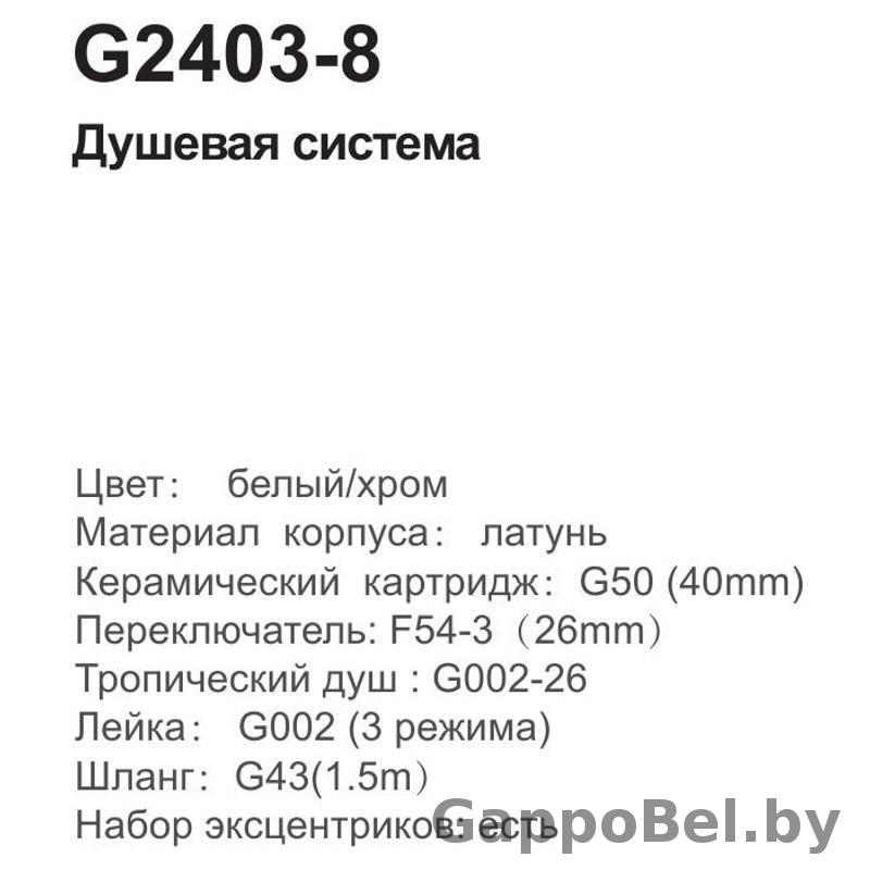 Душевая система Gappo G2403-8 белая со смесителем из латуни. В комплекте тропический душ диаметром 26 см, ручная лейка на три режима с переключением при помощи кнопки. Душевая система Gappo G2403-8 - это непревзойденный стиль и эргономика в каждой детали.
