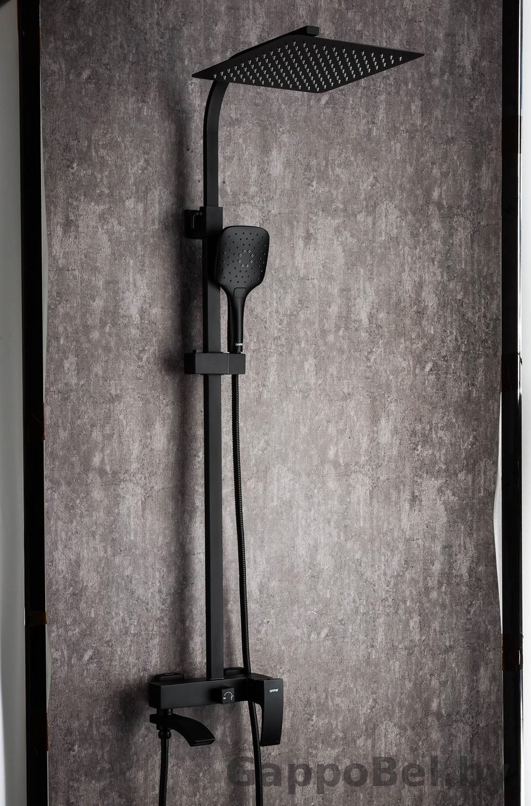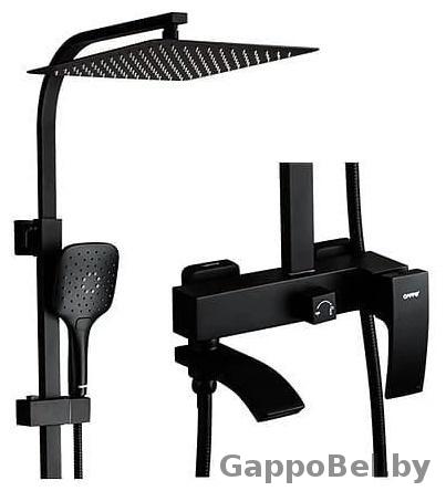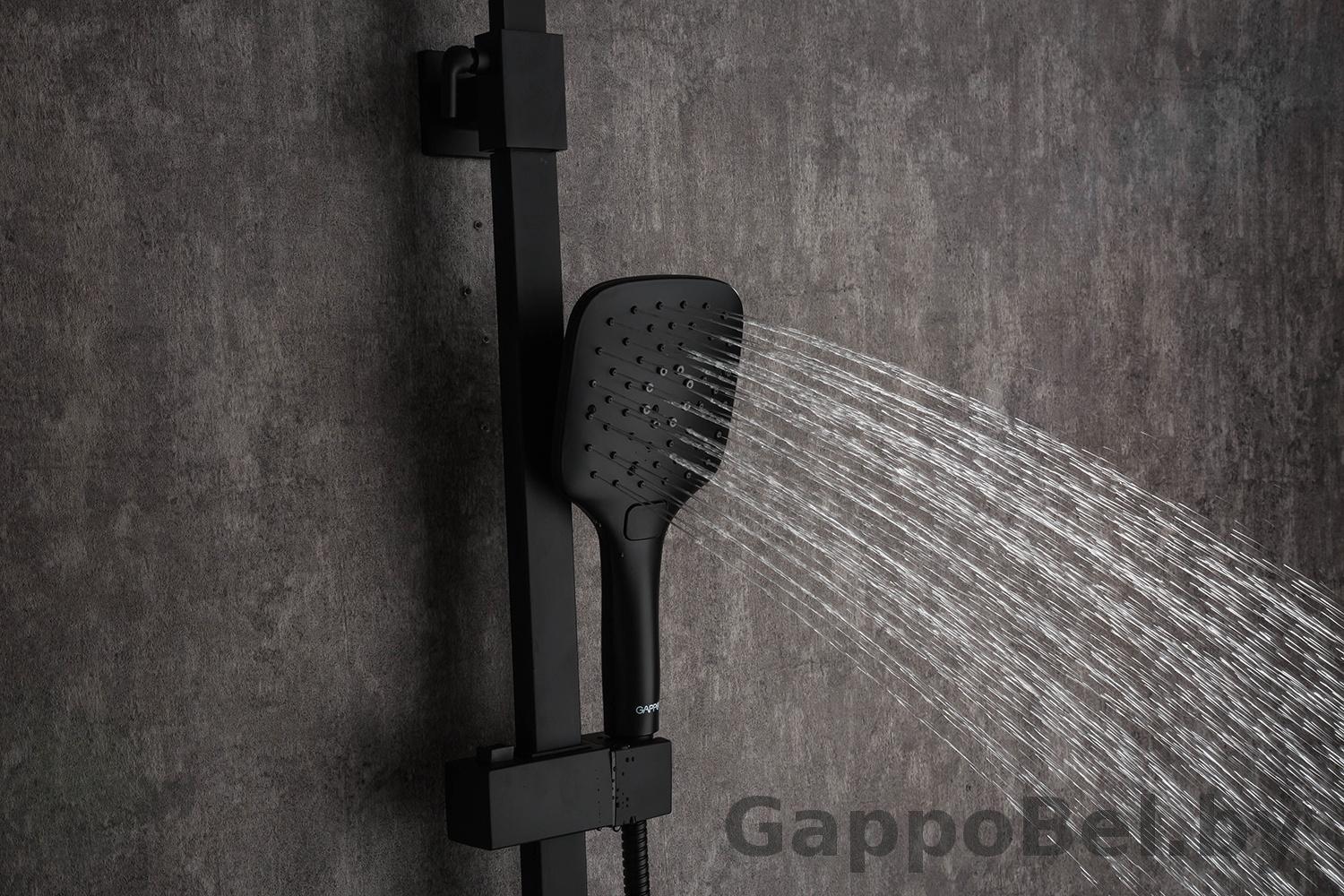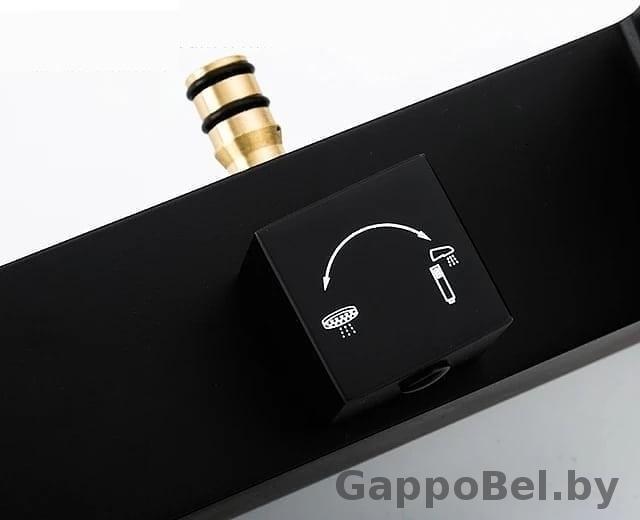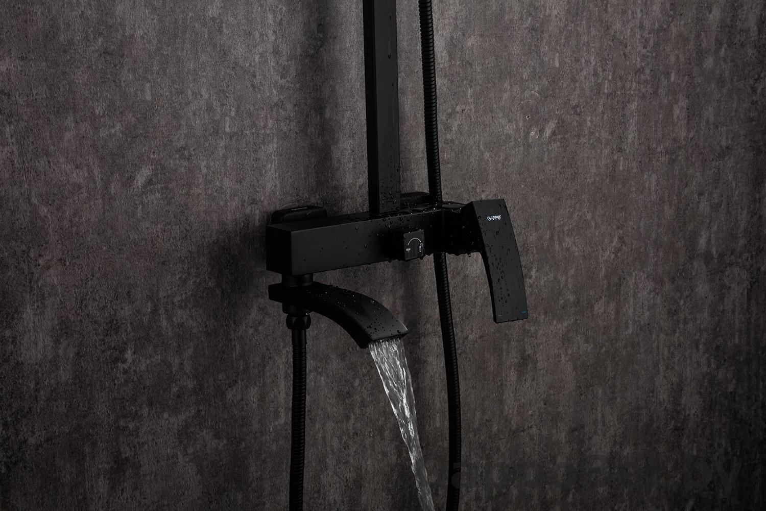 Чёрная душевая система Gappo G2407-6 с изливом и смесителем из латуни и испанским картриджем Sedal. Поворотный каскадный излив быстро наполняет ванную. Силиконовые сопла тропического душа и ручной лейки упрощают уход за системой, а ПВХ-шланг предотвращает накопление известкового камня и не повреждает внешний вид.