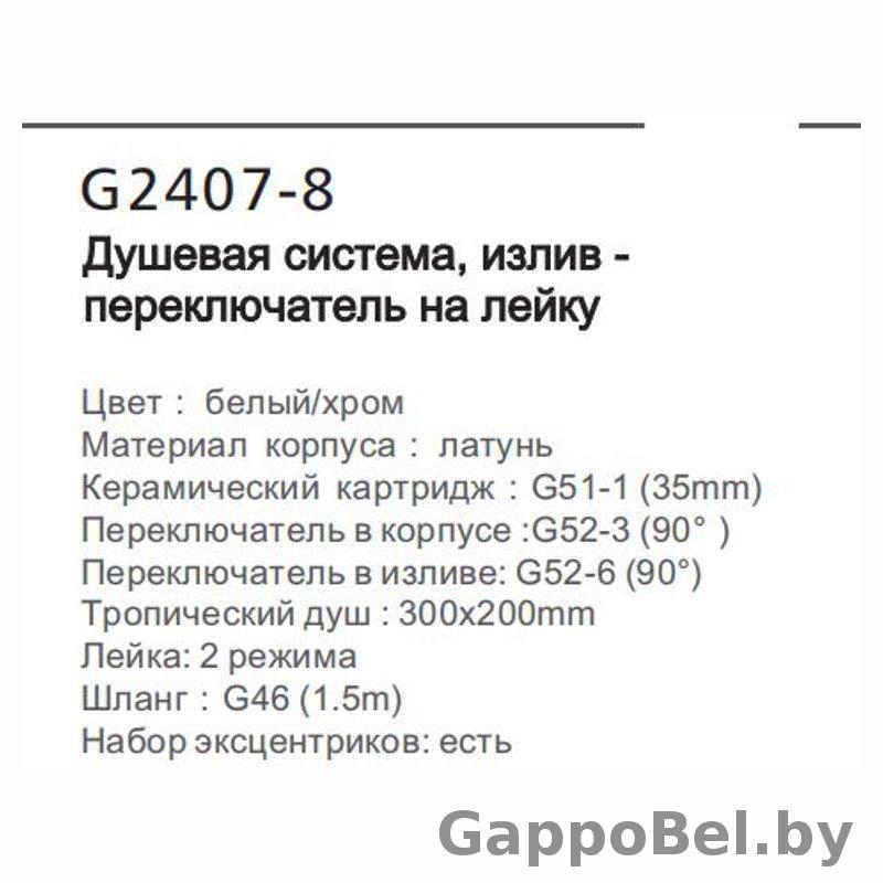 Душевая система Gappo G2407-8 (300×200 мм), белая с хромом, крепится к стене и оснащена латунным смесителем. Силиконовые форсунки упрощают очистку тропического и ручного душа. Поворотный излив удобен для небольших ванных комнат.