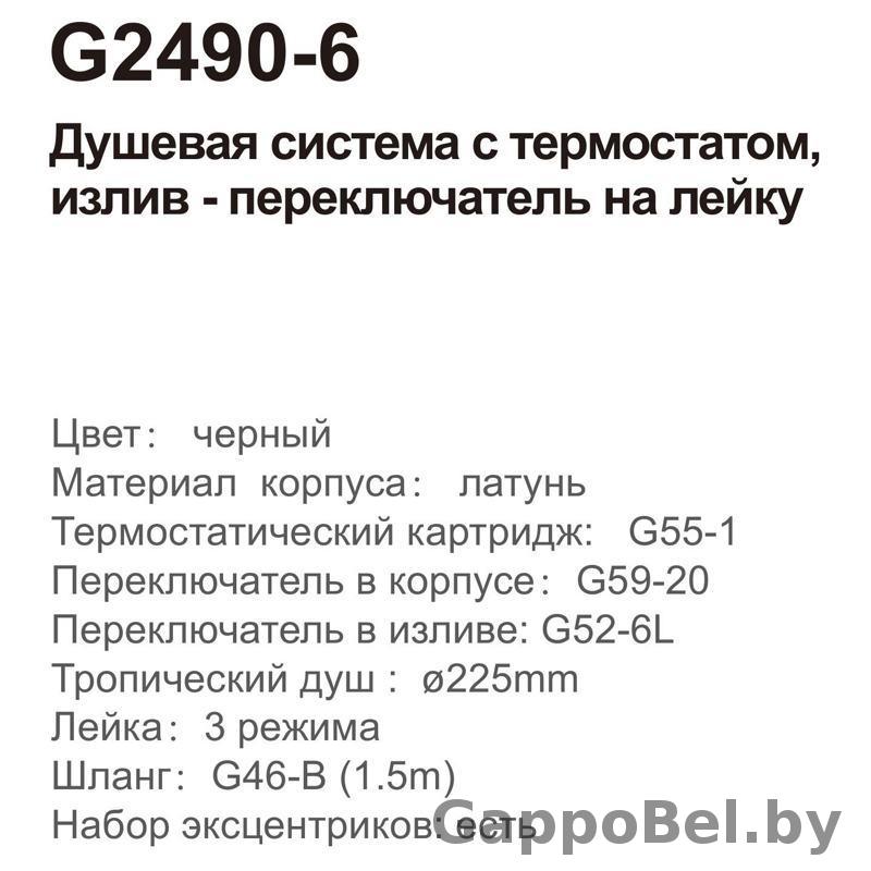 Душевая система с термостатом Gappo G2490-6 имеет высоту тропического душа от монтажных отверстий 1500мм и матовый чёрный цвет. Термостатический смеситель позволяет не беспокоится о перепадах температуры воды, а поворотный излив будет кстати при необходимости набрать ее в ванную. Верхняя лейка имеет круглую форму с диаметром 22,5см, ручная - 11см. Купить чёрный тропический душ можно позвонив нам или оставив заказ в корзине, а мы доставим его в Минске или по всей Беларуси.