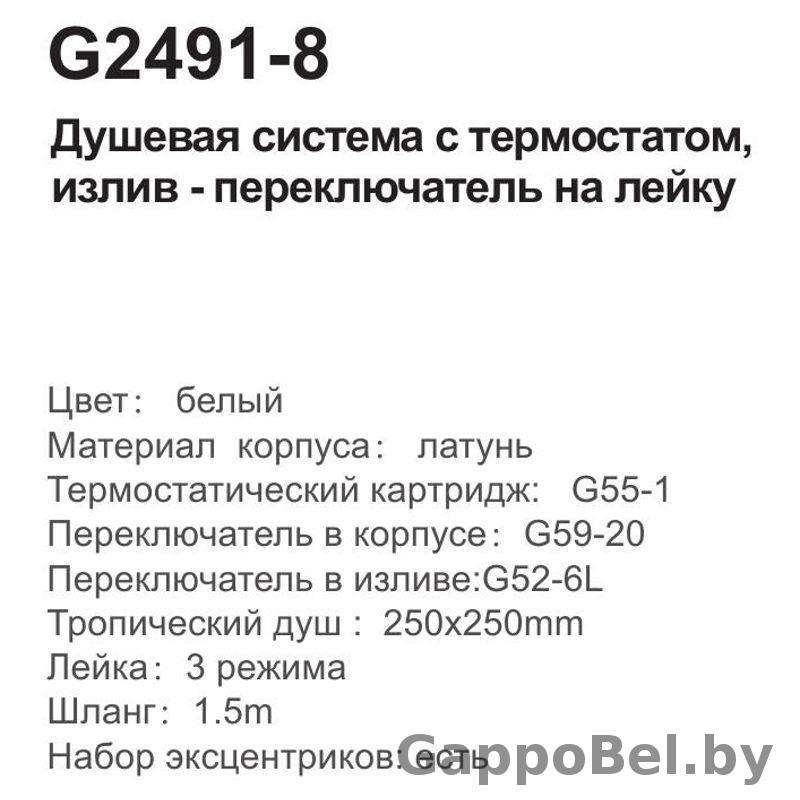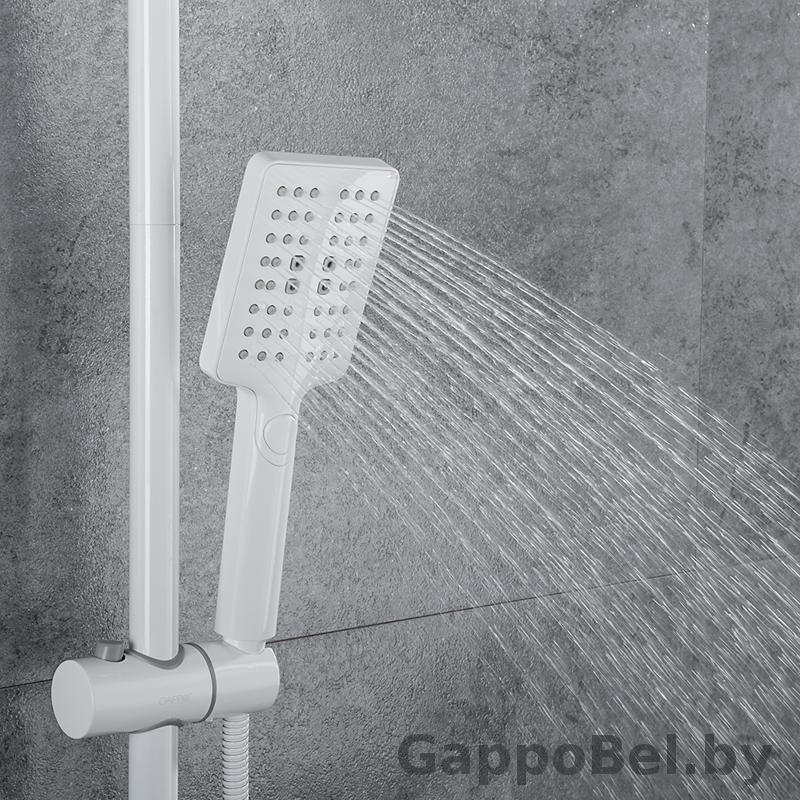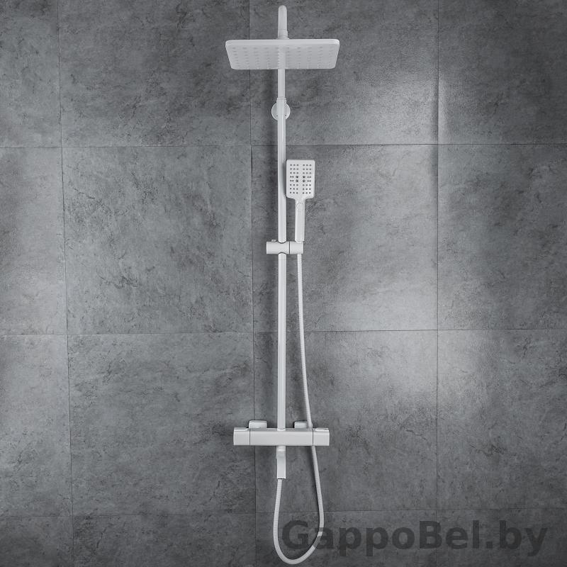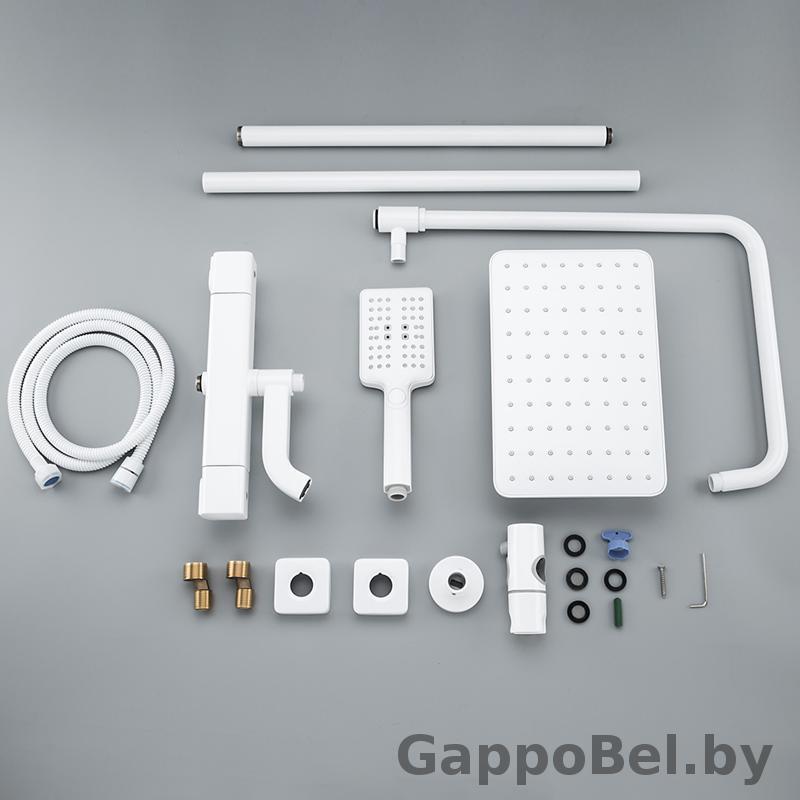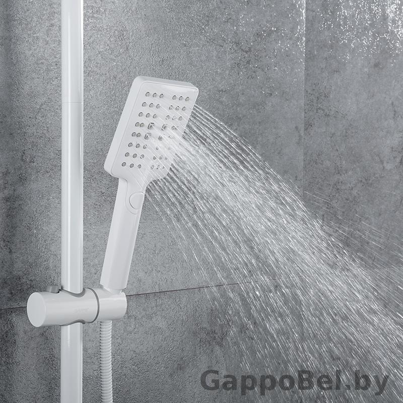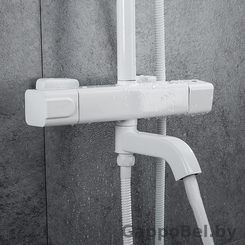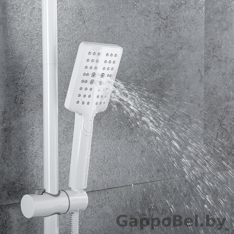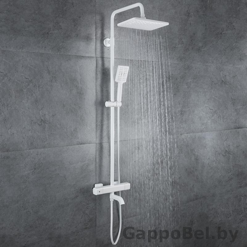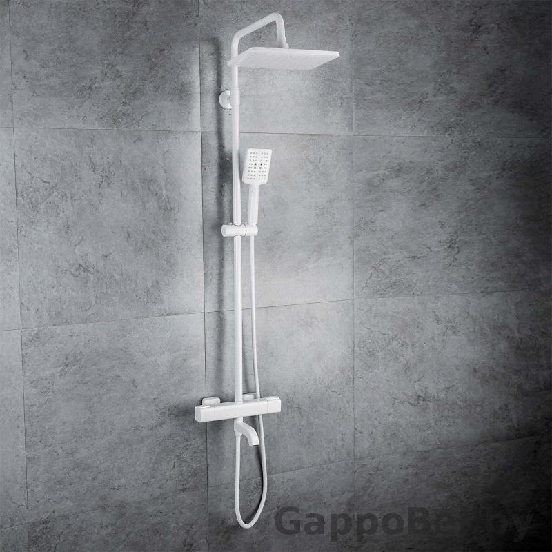 Термостатическая душевая система Gappo G2491-8 (250 мм) с настенным монтажом и белым цветом. В комплекте термостатический смеситель из латуни, поворотный излив для ванны, крупный тропический душ и ручная многорежимная лейка с силиконовыми форсунками. Отличается хорошим качеством и доступной ценой.
