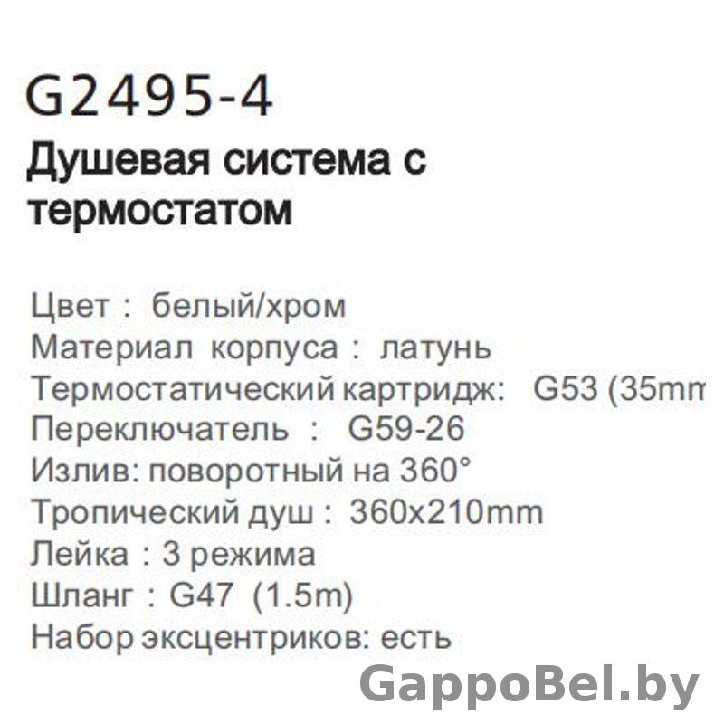 Современная душевая система с термостатом Gappo G2495-4 подойдет в любую ванную или душевую кабину. Ее стильный дизайнерский смеситель имеет белый цвет с хромом и его можно использовать как полочку. В комплекте качественная ручная лейка с гидромассажной функцией и шлангом ПВХ, который считается самым лучшим в своем роде. Он не будет собирать налет и никогда не поцарапает покрытие смесителя.