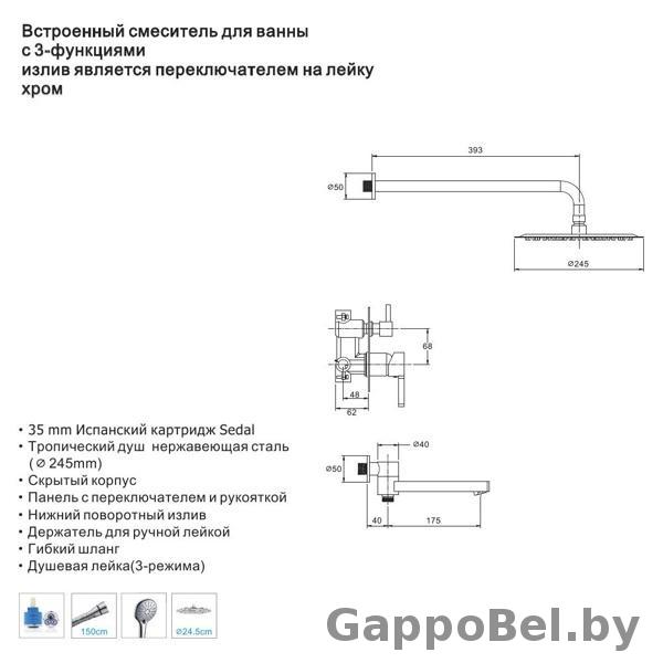 Скрытая душевая система Gappo G7104 (250 мм) встраивается в стену. В этой модели предусмотрена вся возможная комплектация для душевой системы. Имеется поворотный излив, что очень удобно для экономии пространства кабины и приятного пользования всем изделием. В комплекте хорошая гидромассажная ручная рейка на три режима и верхний душ диаметром 25см, что является хорошим показателем.