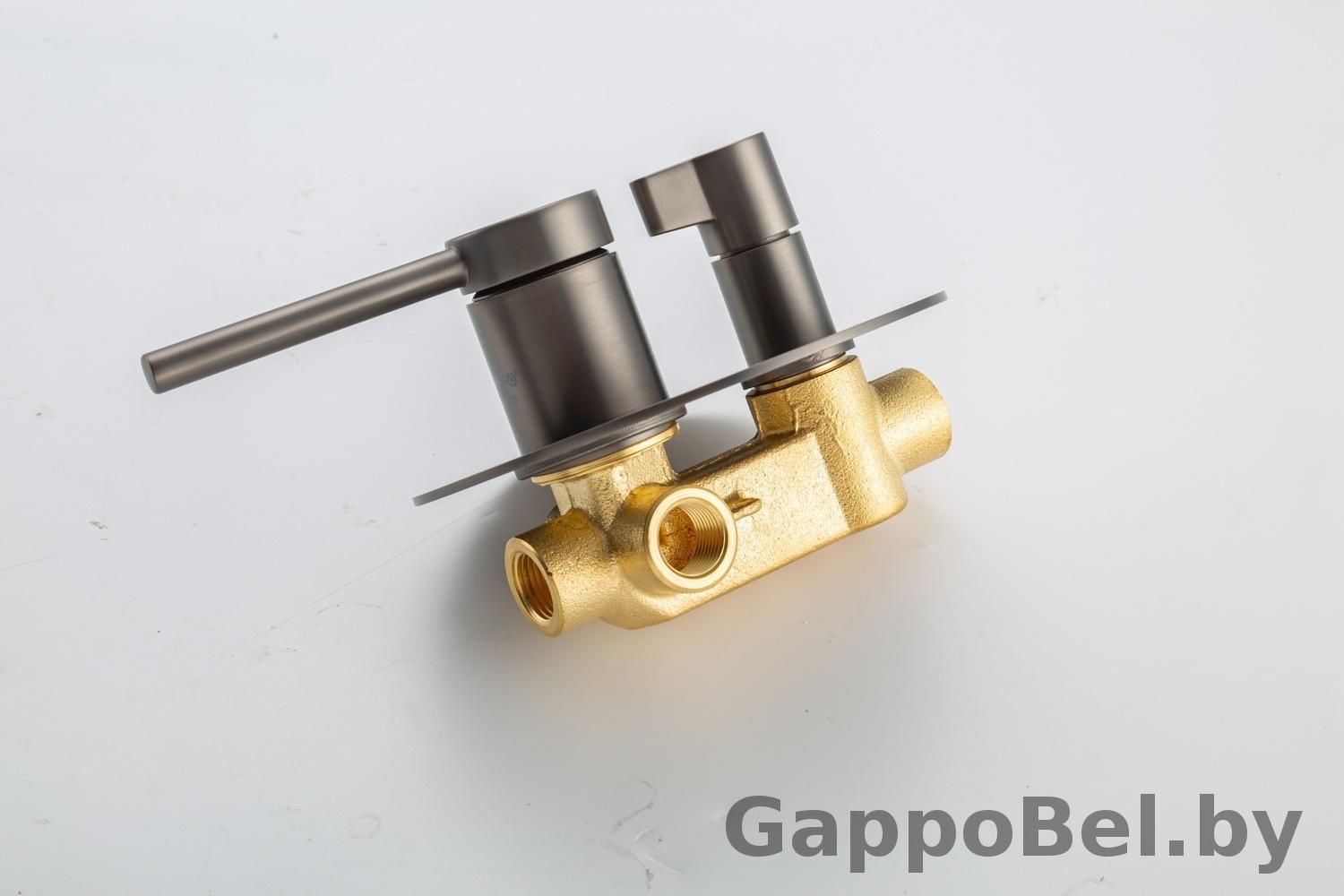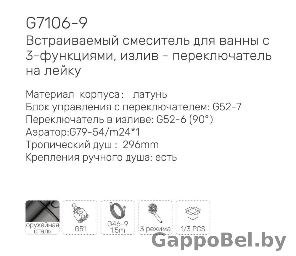 Душевая система скрытого монтажа Gappo G7106-9 выполнена из латуни с покрытием цвета оружейной стали. Включает верхний тропический душ с регулируемым наклоном, поворотный излив, однорычажный смеситель и ручную лейку с держателем и шлангом.