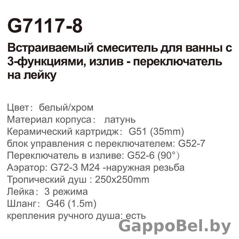 Душевая система скрытого монтажа Gappo G7117-8 (250 мм) имеет белый цвет и хром. В комплекте отличная ручная лейка большого размера с переключением режимов при помощи нажатия кнопки. Как уже говорилось ранее, система получила скрытый монтаж в стену - такие варианты пользуются спросом в душевые кабины или небольшие ванные. Механический смеситель изготавливается из латуни с использованием испанского картриджа Sedal. А поворотный излив всегда будет под рукой в случае необходимости.