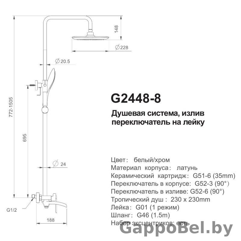 Душевая система с каскадным изливом для ванны Gappo G2448-8, цвет белый с хромом, премиальная душевая система от Gappo по доступной цене, в комплекте тропическая лейка и ручная из ABS-пластика, шланг 150 см.