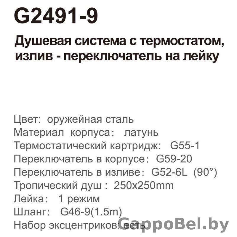 Душевая система с термостатом Gappo G2491-9 в цвете оружейная сталь. Смеситель с термостатом из латуни, верхний душ и ручная лейка из ABS-пластика с системой легкой очистки. Поворотный излив для ванны служит переключателем на душевую лейку.