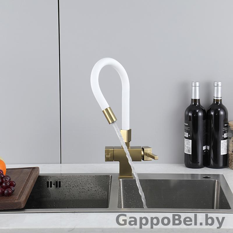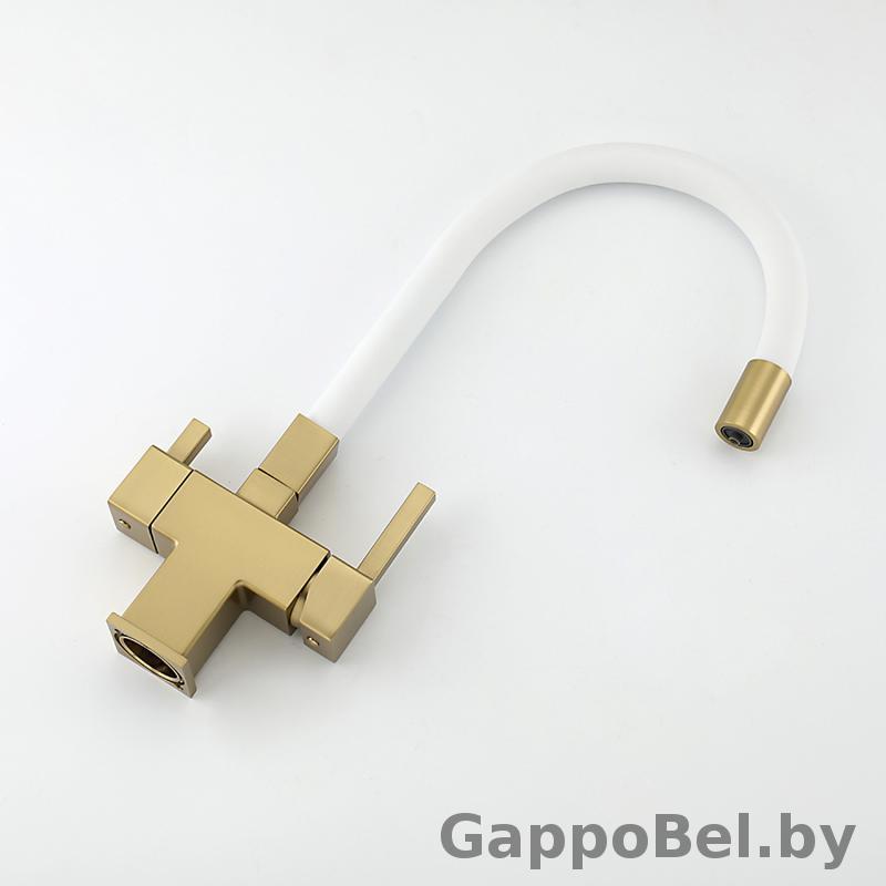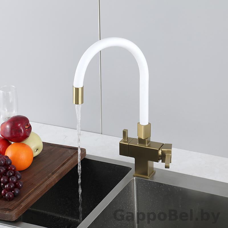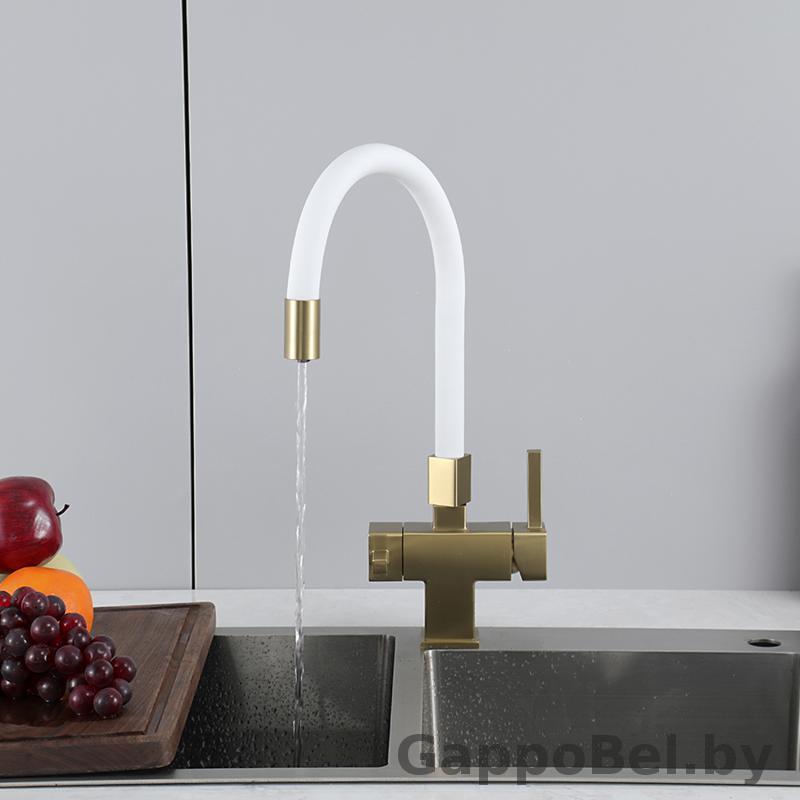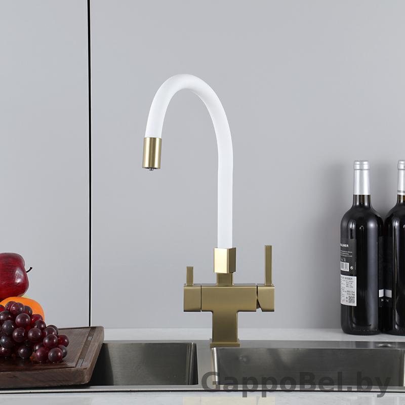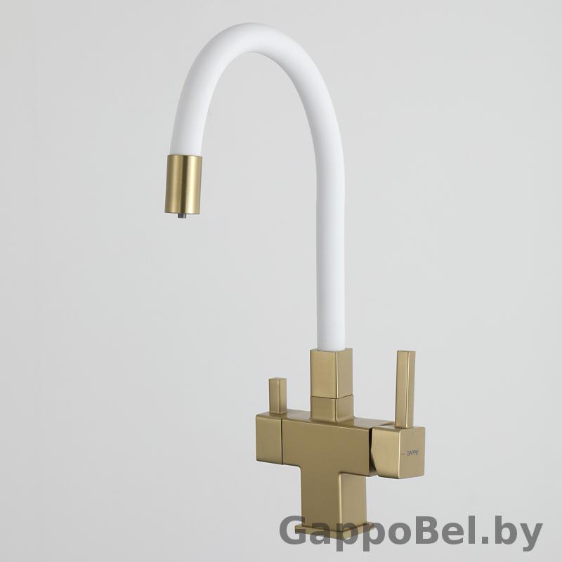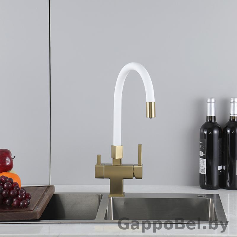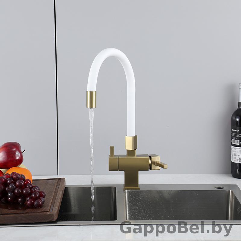 Смеситель для кухни с подключением питьевой воды Gappo G4395-33 (золотой), гибкий силиконовый излив, надежный латунный корпус, керамический картридж 35 мм.