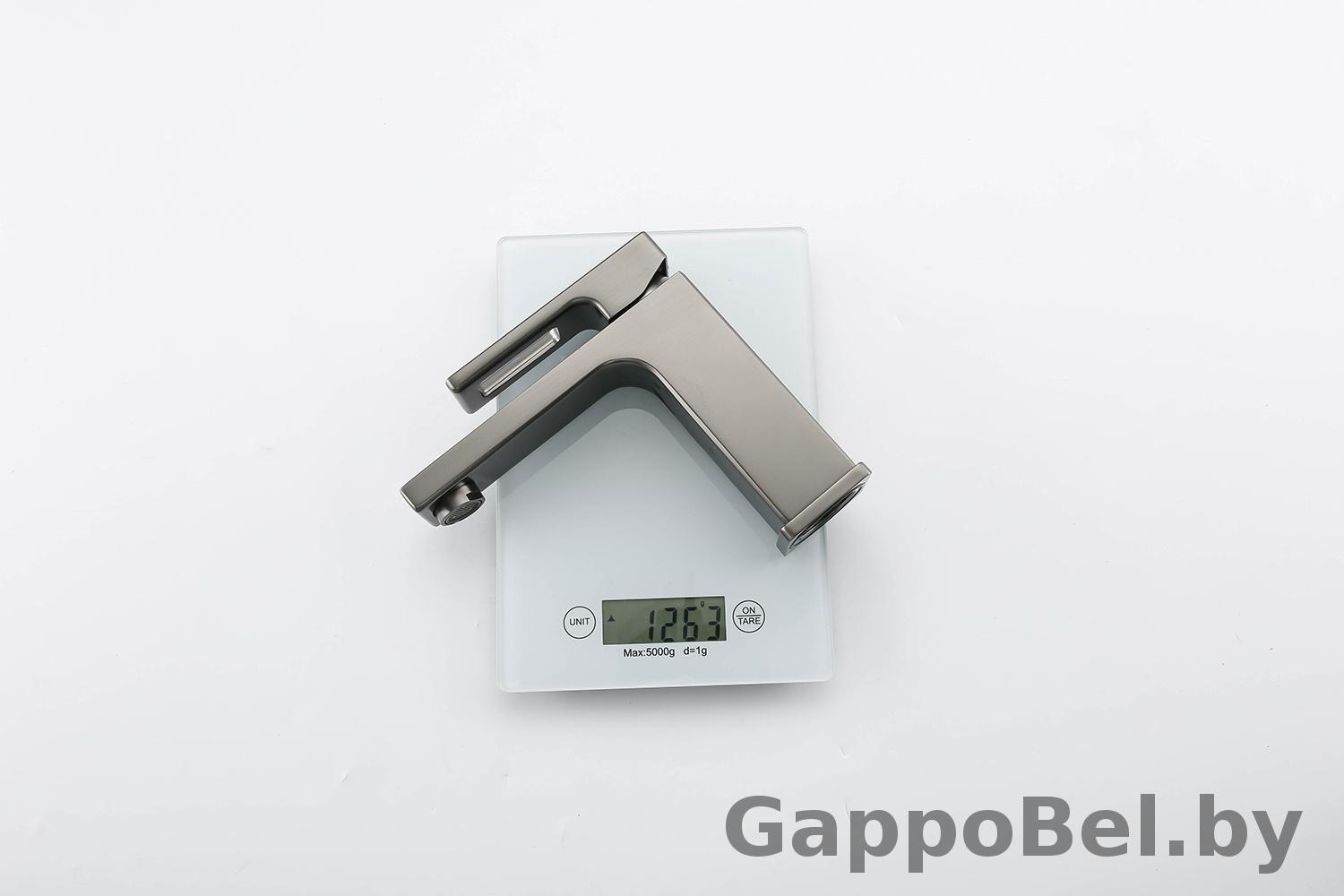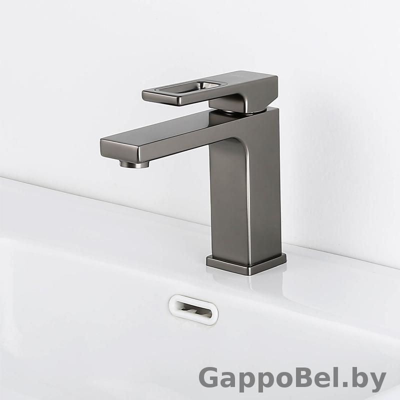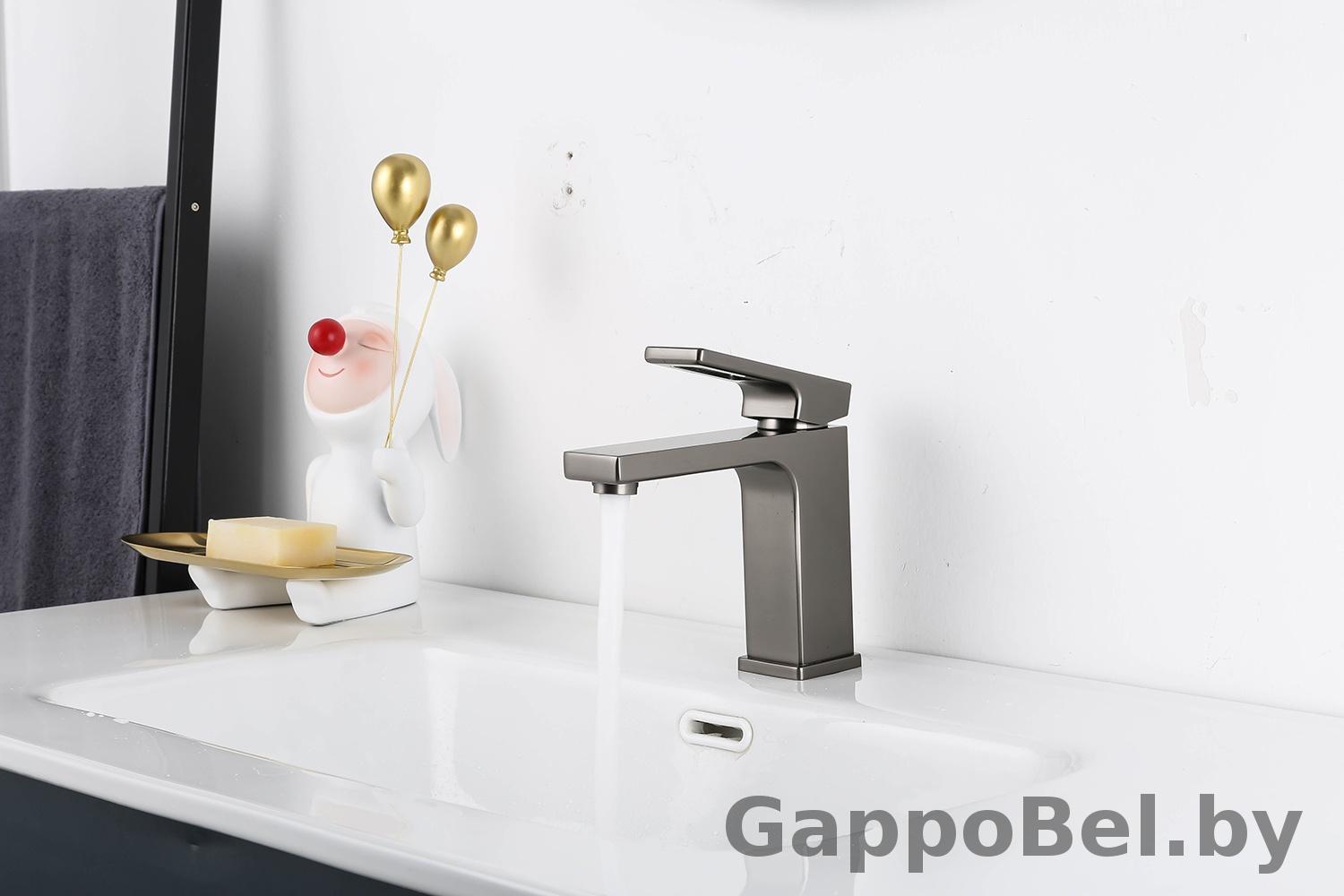 Квадратный смеситель для умывальника Gappo G1017-9, цвет оружейная сталь, изготовлен из латуни, большой вылет излива для удобного пользования раковиной.