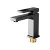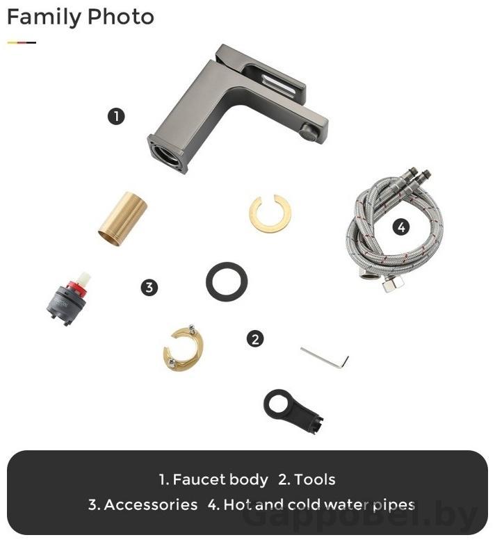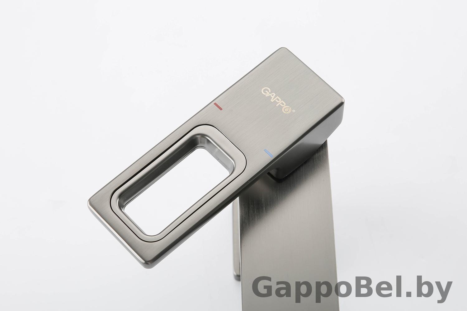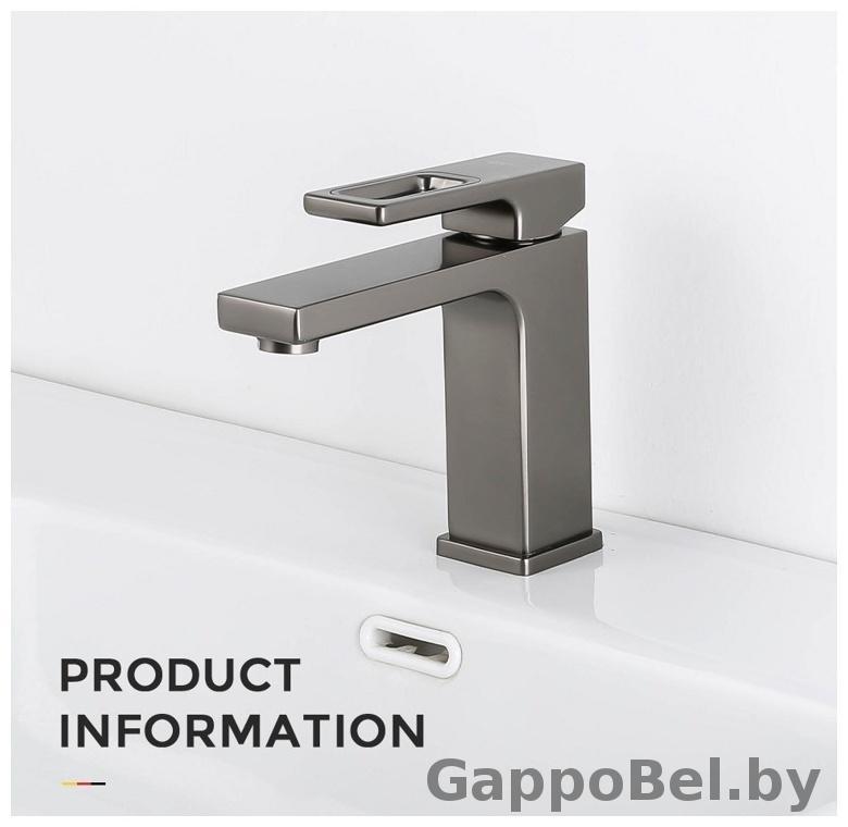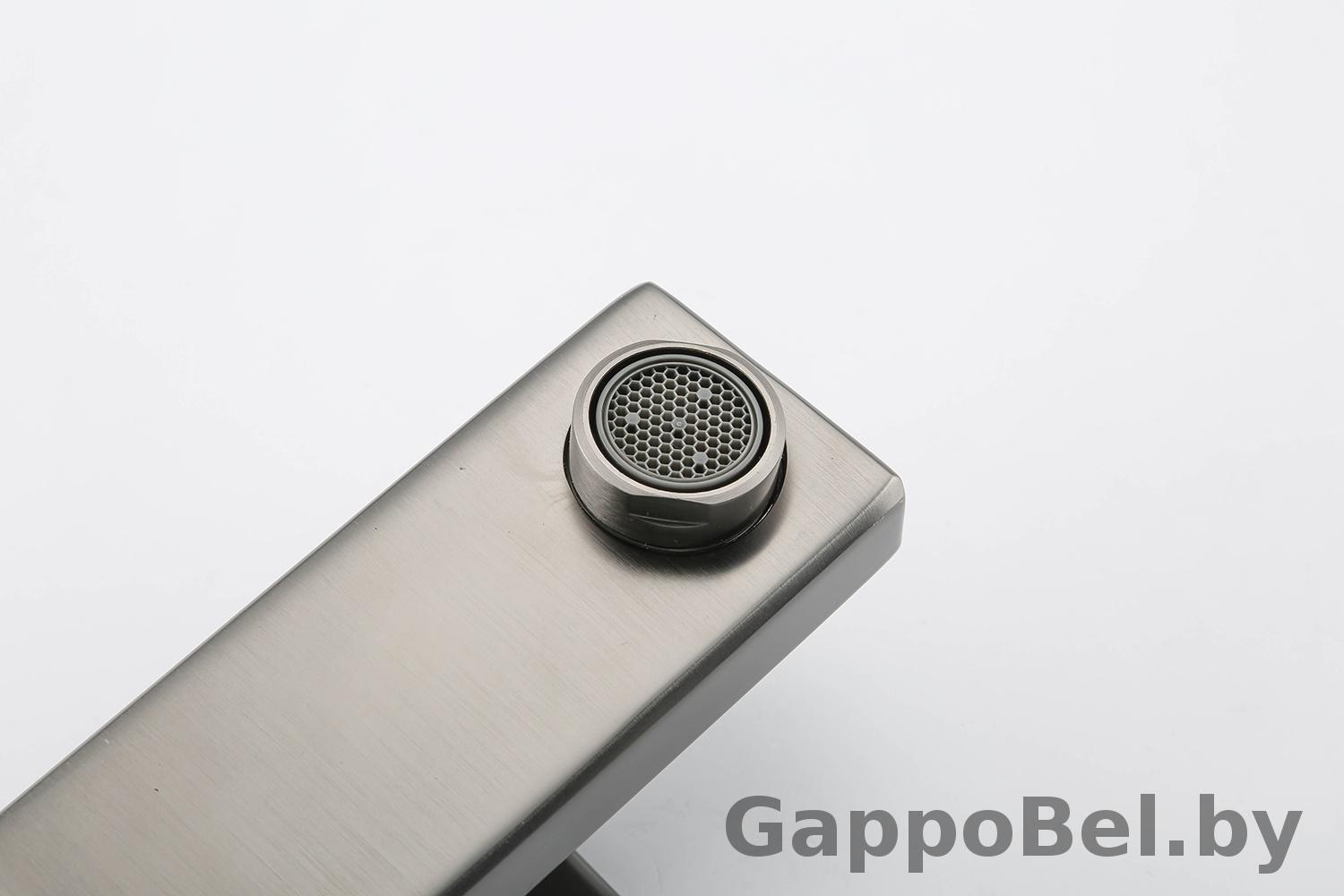 Квадратный смеситель для умывальника Gappo G1017-9, цвет оружейная сталь, изготовлен из латуни, большой вылет излива для удобного пользования раковиной.